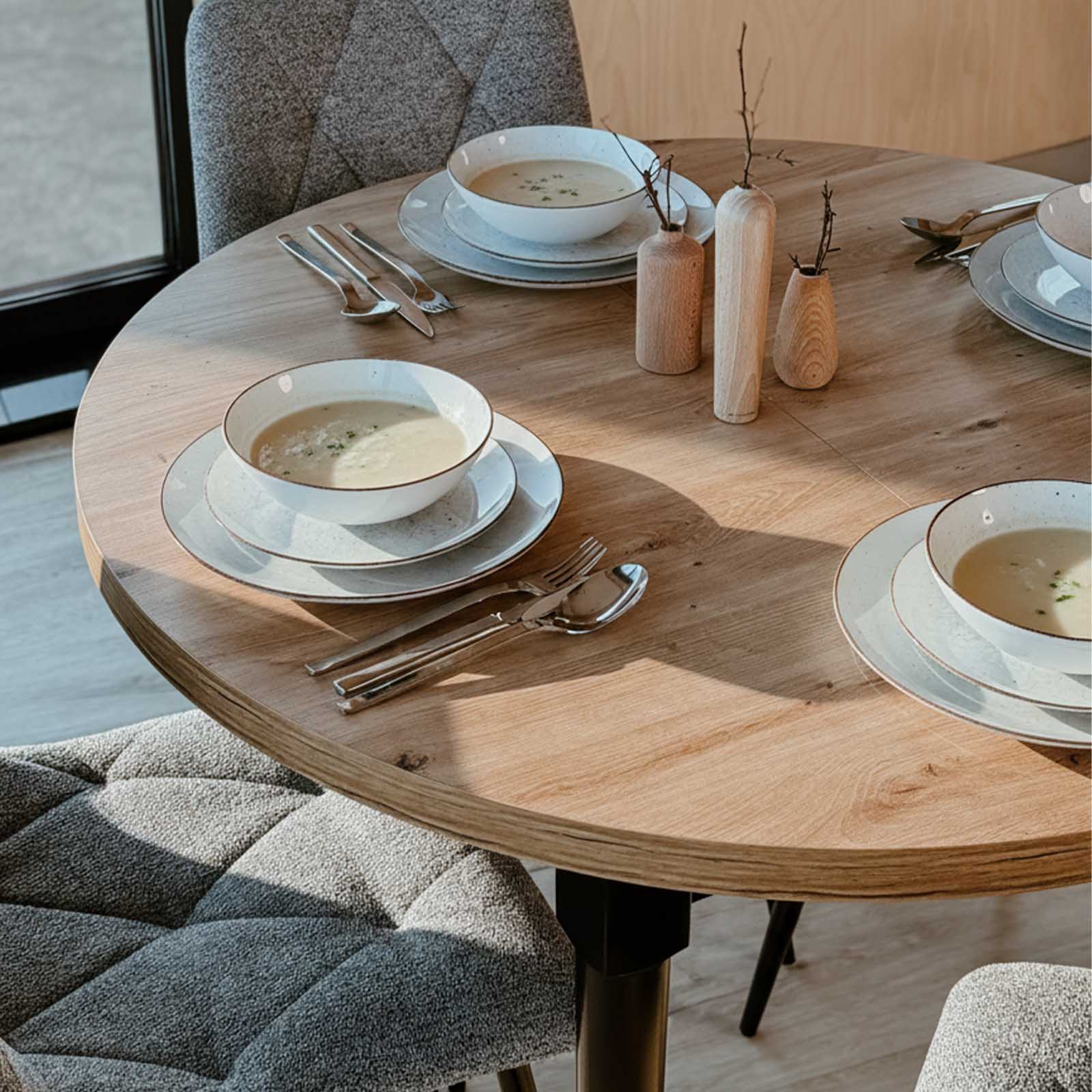 Stół okrągły rozkładany stół do jadalni salonu płyta laminowana dąb wotan nogi czarne drewniane odys st-35