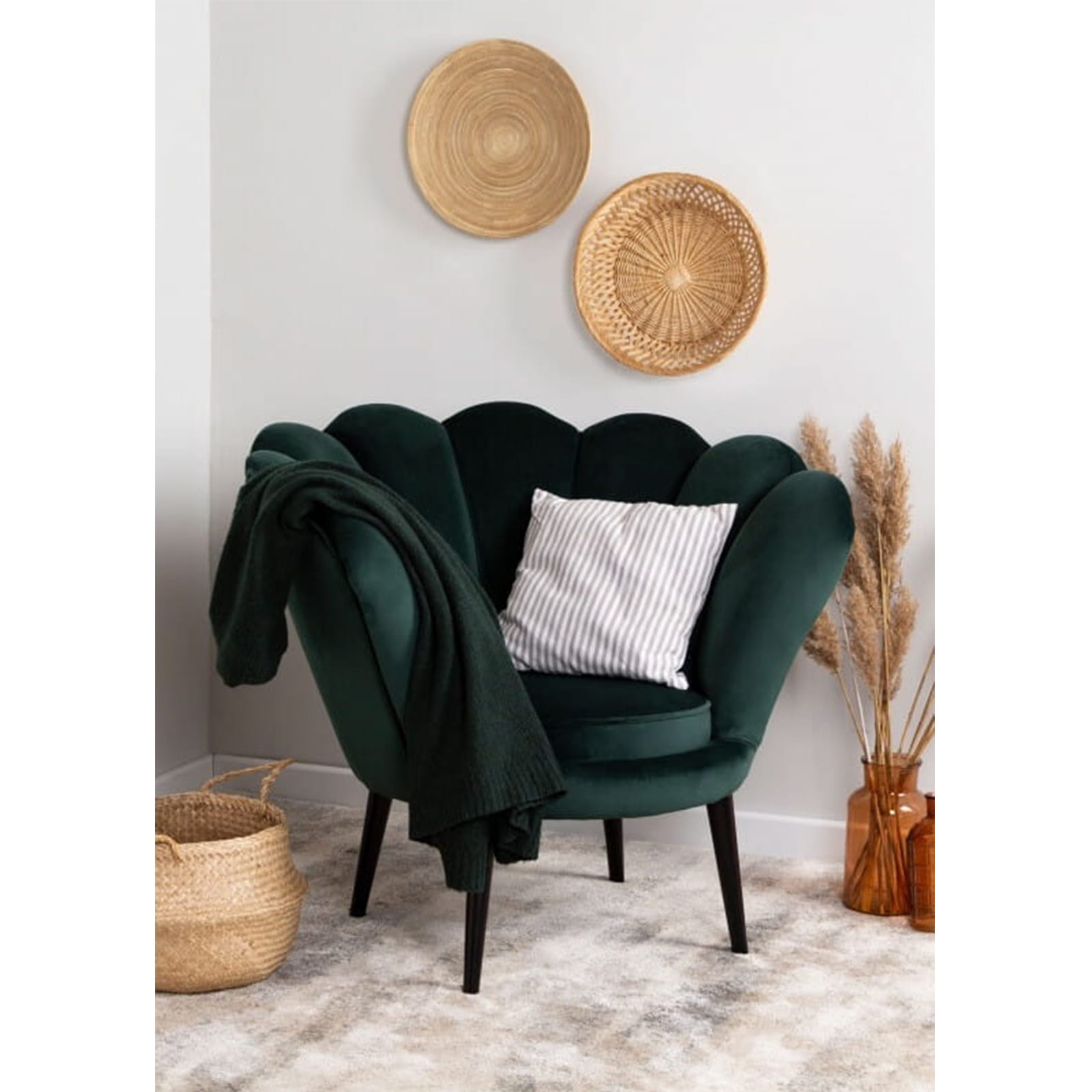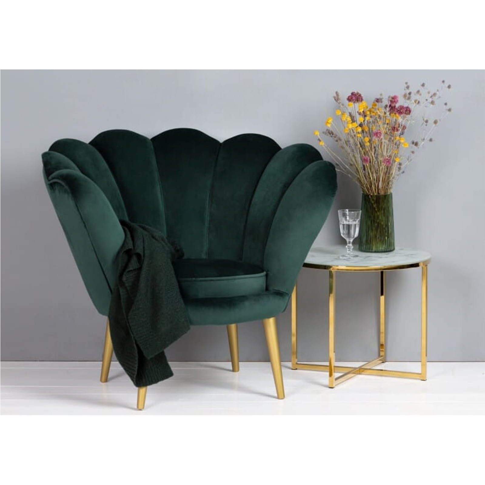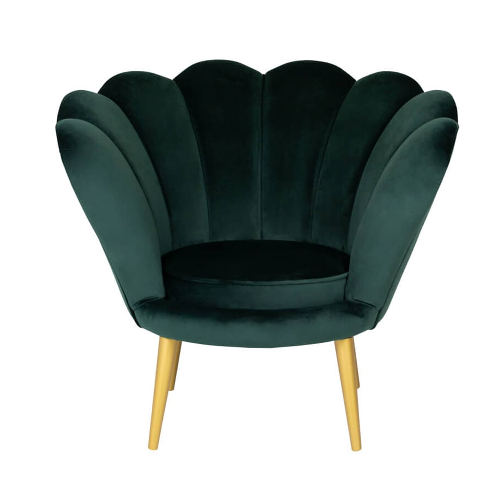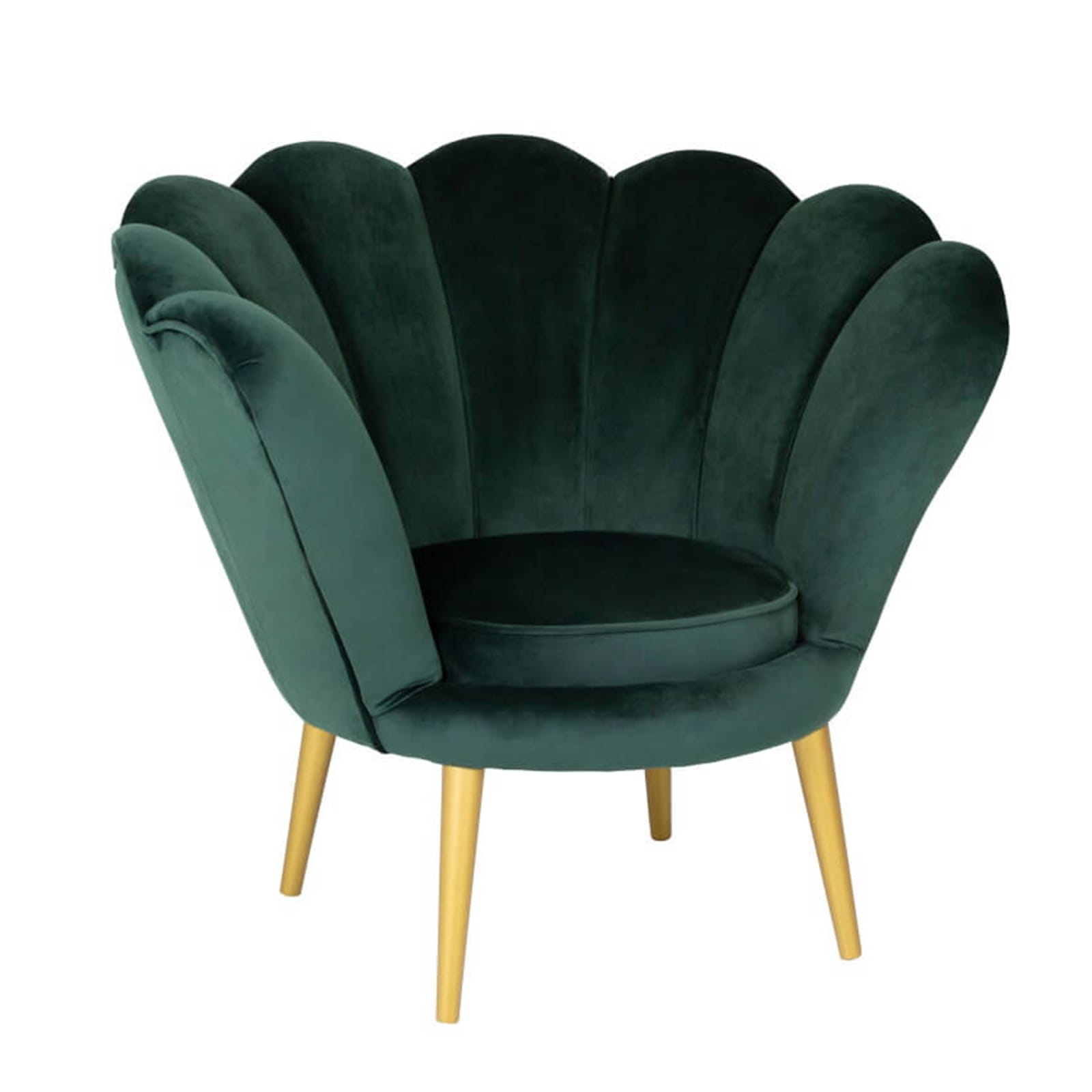 Fotel skandynawski muszelka welur velvet do salonu czarne złote drewniane nogi zielony butelkowa zieleń tristan