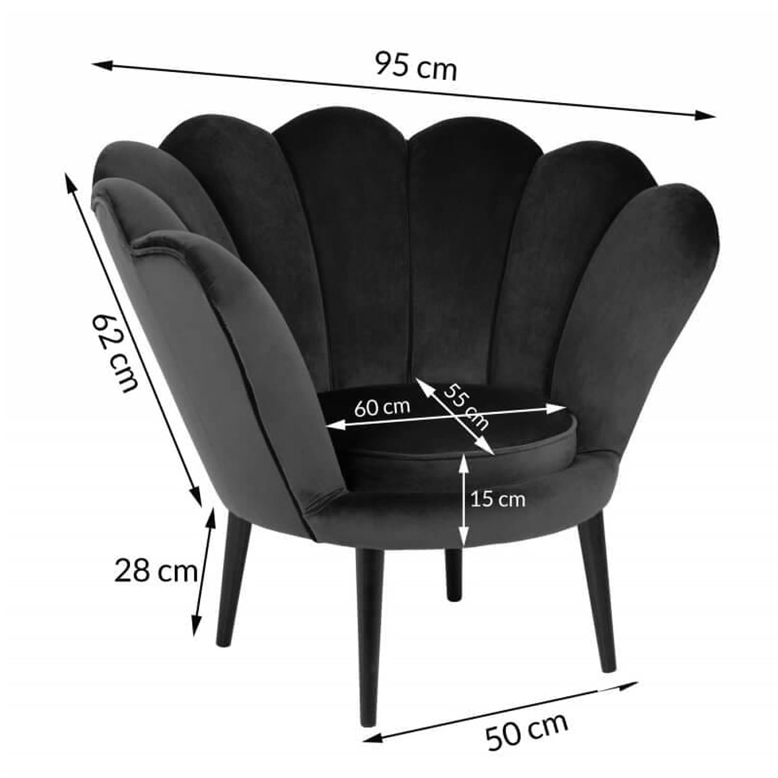 Wymiary fotela przedstawione są na zdjęciu.