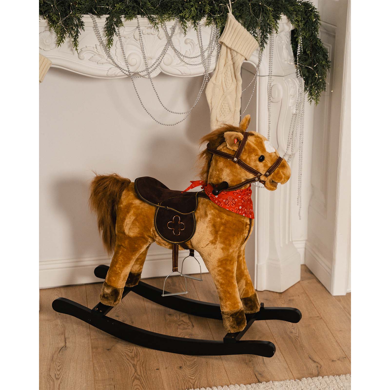 Koń na biegunach o imieniu Ares to świetny pomysł na prezent dla dziecka. Konik pokryty jest miękkim pluszem w kolorze brązowym i posiada drewniane płozy. Dodatkowo wyposażony jest w drewniane rączki. Stanie się idealnym towarzyszem zabaw! Konik wyposażony jest w wygodne, dopasowane siodełko, które sprawia, że zabawa jest bezpieczna i komfortowa. Do siodełka zamocowane są metalowe, ozdobne strzemiona. Na czerwonej chusteczce zostały ułożone piękne lejce do trzymania podczas galopu, dzięki którym dziecko poczuje się jak na prawdziwej przejażdżce konno.